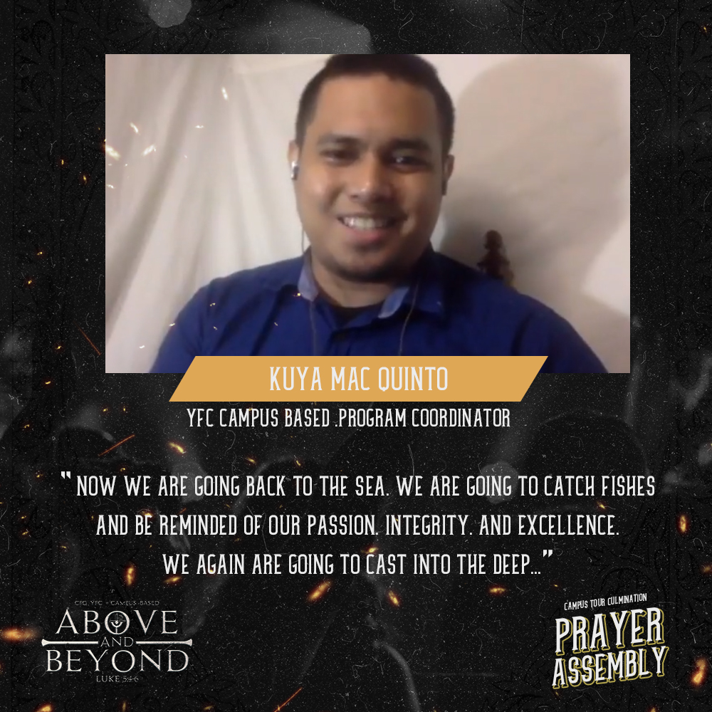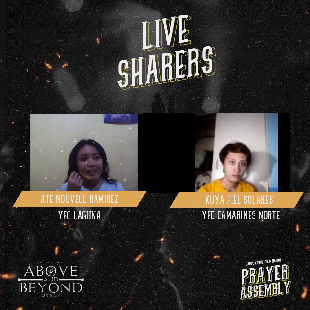 The four weeks of inspiring sessions and workshops were concluded through an International Prayer Assembly via zoom. But in the realm of going Above and Beyond, the program team of the culminating activity created a two-part special event. The first part was broadcasted live via facebook where different performances from different areas were showcased. A tribute segment was also given for all the YFC Campus Based who graduated this academic year. After the live broadcast, the participants were redirected to a more intimate gathering in the zoom Prayer Assembly. Inspiring stories and sharing were witnessed by the whole team and all was a grace filled moment of basking on to God’s generosity through this community.